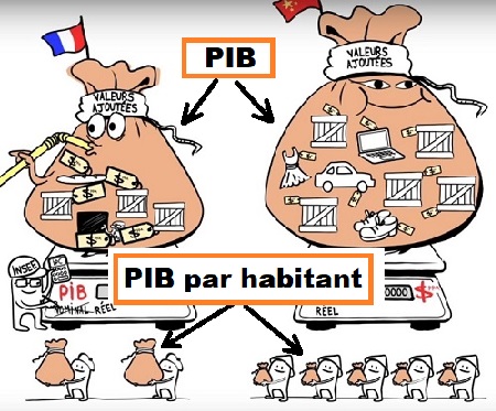 Par exemple la Chine qui a un PIB global plus élevé que la France, a un PIB par habitant moins élevé. Les chinois sont en effet bien plus nombreux que les français : 1,393 milliards contre 67 millions d'habitants (image 1).