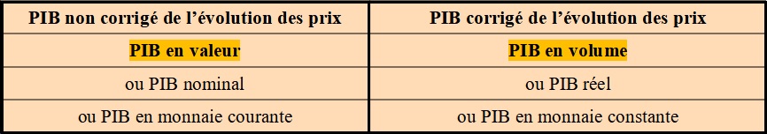 Lorsque la valeur du PIB augmente, cela peut être dû à l’augmentation des quantités produites et / ou à l’augmentation du prix des biens et des services produits. Or il y a une augmentation des richesses seulement dans le premier cas. Ainsi, pour étudier l’augmentation des richesses, les économistes étudient l’augmentation du PIB pour laquelle l’effet lié à la variation des prix a été supprimée : il s’agit du PIB en volume. Ainsi on distingue deux types de PIB :