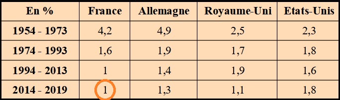 Selon le tableau 2, et d'après les données du conference board, entre 2014 et 2019, le produit intérieur brut (PIB) de la France a augmenté de 1% en moyenne chaque année.