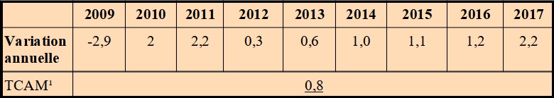 ¹ : le taux de croissance annuel moyen (TCAM) est le taux de variation moyen sur la période de 2009 à 2017. Cela veut dire que si le taux de croissance avait été le même chaque année, il aurait été de 0,8 %.